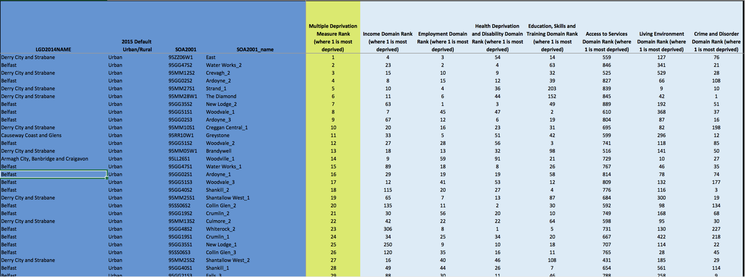 The MDM is used to determine the relative deprivation ranking. An SOA ranked 1 under MDM, is considered the most deprived area in NI. The SOA ranked 890 is considered the least deprived. NISRA is careful to stipulate that this does not mean richest (most affluent) and poorest (least affluent) areas; and that SOAs can contain significant variations in deprivation. But, to many people they have crudely become a rule of thumb. Often funding will prioritise projects within the ‘most deprived areas’ before considering individual project circumstances of those not among the most deprived areas.